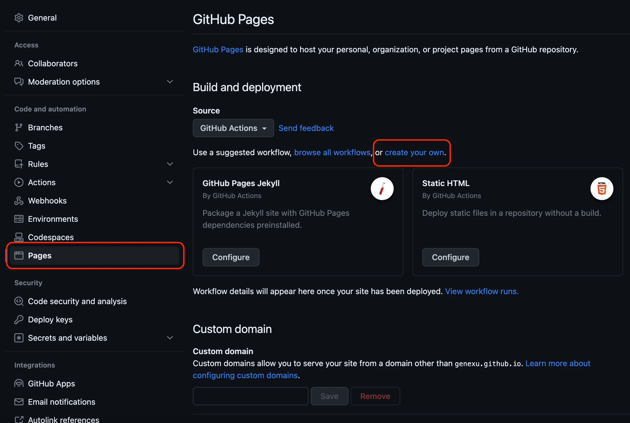 進入 Repository 的 Settings,找到 GitHub Pages,並設定 Source 為 GitHub Action,點選 Create your own 來建立一個新的 workflow。