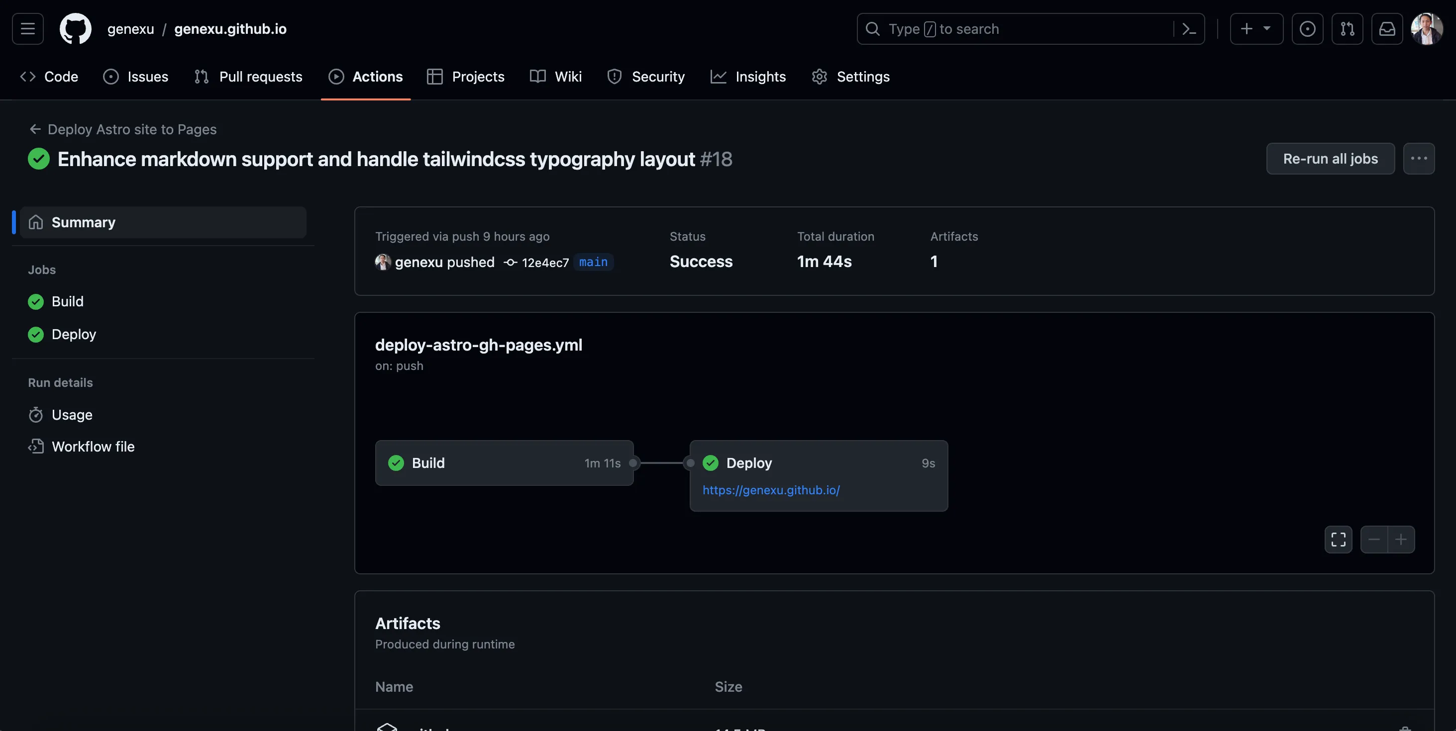 Boom! That’s it. 之後每次 Git push 到 main branch 時,Github Action 就會自動 build & deploy 到 Github Pages。