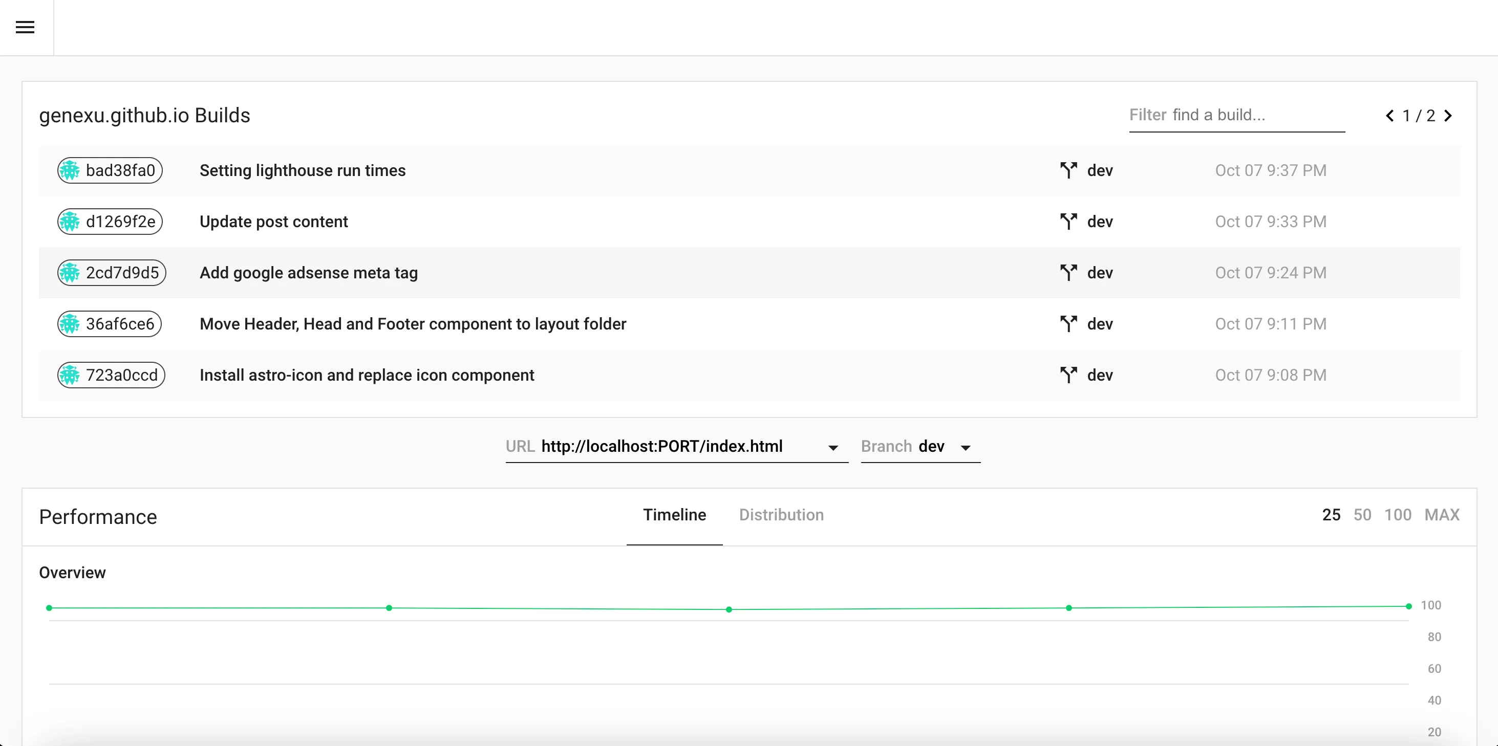 可於 Lighthouse CI Server 上看見 Report,具備時間軸,可持續追蹤效能指標變化。